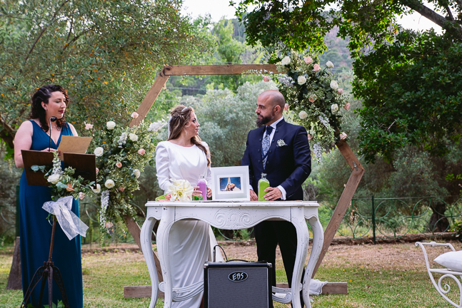 El «Sí quiero» se lo dieron en el Cortijo señorio de los Cotos, trás las promesas y declaración de sentimientos de sus votos y el intercambio de alianzas, la pareja con gran emoción quedaba unida en matrimonio.